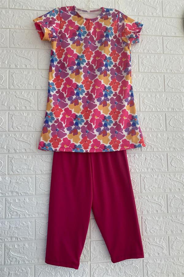 Kız Çocuk Yarı Kapalı Tesettür Mayo Pembe Batik Desenli