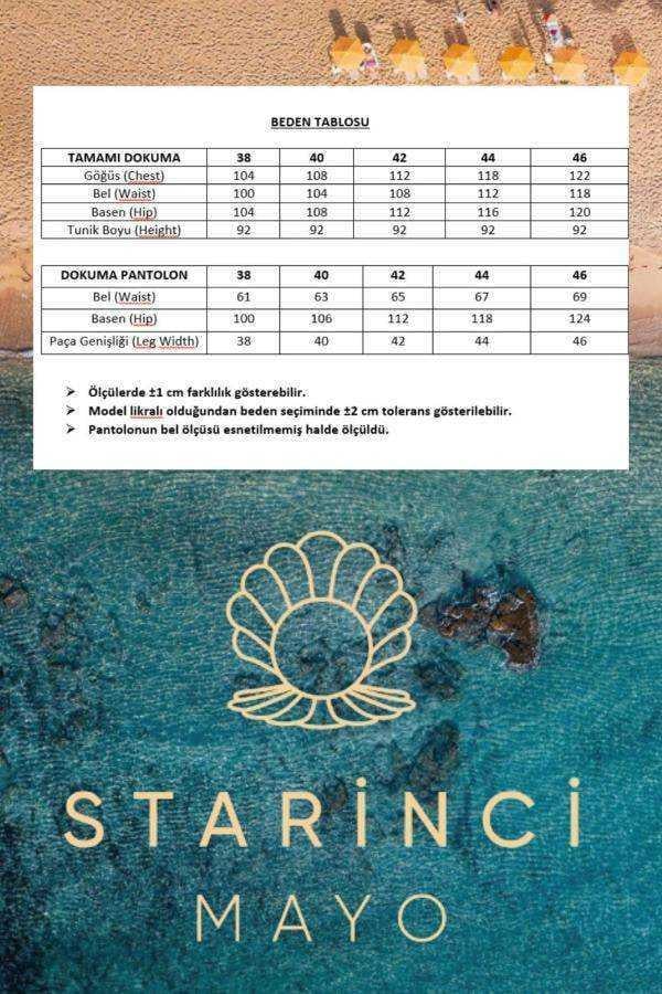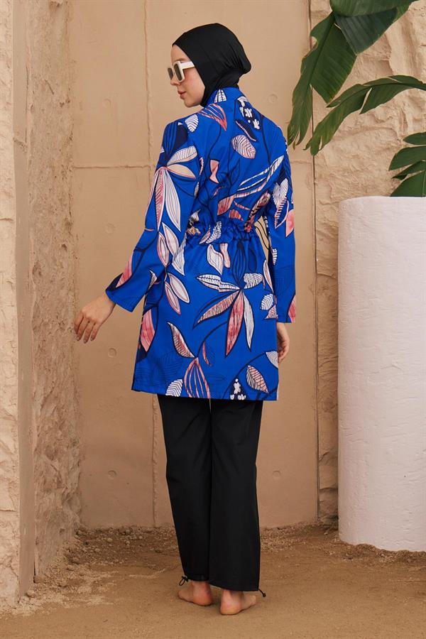 Rahat kesim tam kapalı mayo takımında paraşüt pantolon ve tunik, likralı eşarp ve büstiyer vardır. Paraşüt desenli tuniğin su itici özelliği vardır. Bone ve büstiyer güneşte hızlı kurur. Belinde ve paçasındaki lastikler sayesinde vücudunuza göre ayarlayabilirsiniz. Eşarbın tuniğin içinde kalan kısmı fazla olduğundan açılma gibi bir durum olmaz. Denizde, havuzda ve termal sularda giyinmeye uygundur. Pantolonunu spor yaparkende giyinebilirsiniz. 38-40-42-44-46 bedenleri vardır. Beden seçimi yaparken ölçü tablosunu dikkate almanızı öneririz. Fermuarı boydan boya açıldığından rahatça giyinebilirsiniz.